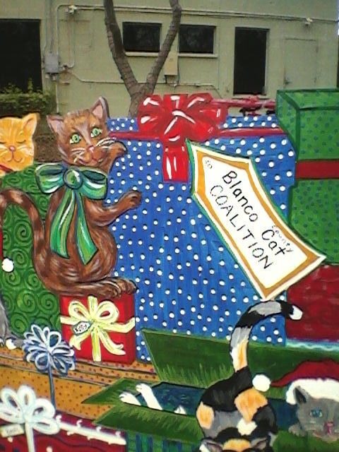 The Blanco High School art teacher, Perry Kuebel, and some of her students made this display that is now located in Bindseil Park as part of the Christmas display. Our Cat Coalition helped her with some cats and this is a wonderful gift in return for us!